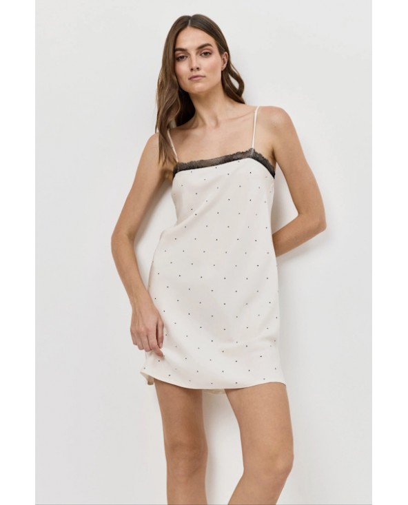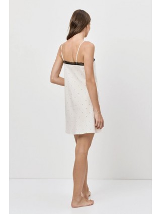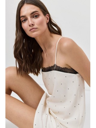 Nuisette légère et fluide, couleur ivoire avec un motifs à pois noir et sur le haut une dentelle. Modèle Ada de la marque Aruelle.