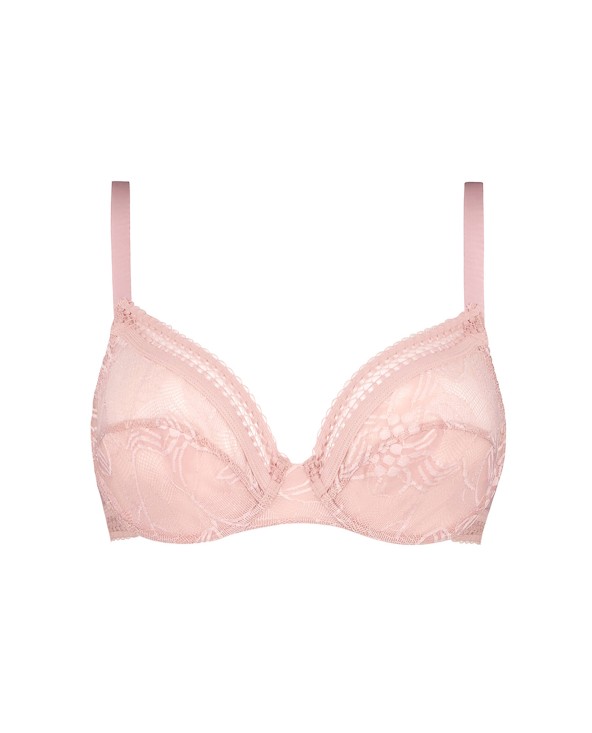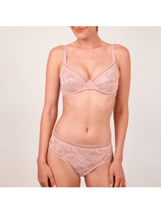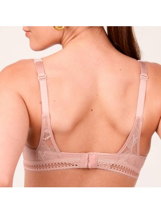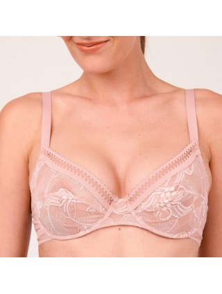 Soutien-gorge englobant en belle dentelle élastiquée vieux rose, bon maintien et invisible sous le blanc pour les carnations très blanches.