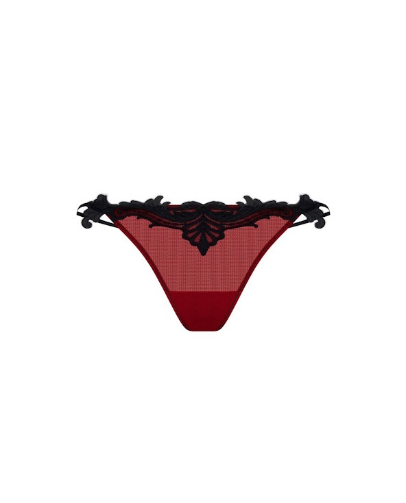 Slip en soie rouge, fines guipures noire sur les hanches. modèle Bellissime Inconnue de la marque Lise Charmel.
