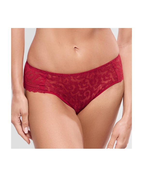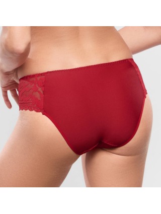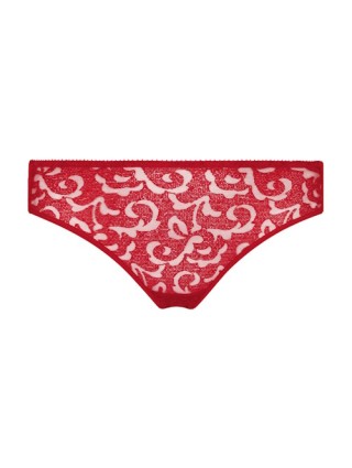 Slip rouge invisible sous le blanc, avec sur le devant une broderie suisse sur un tulle, sur les côtés une dentelle française et derrière une microfibre douce et très confortable. Du modèle Leia de la marque Empreinte.