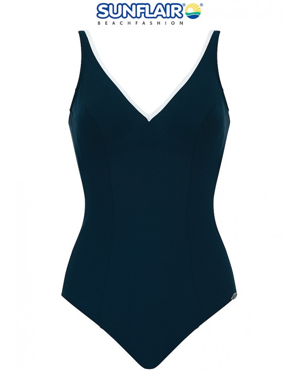 Maillot une piéce bleu marine avec une bordure blanche et des coques de la marque Sunflair.